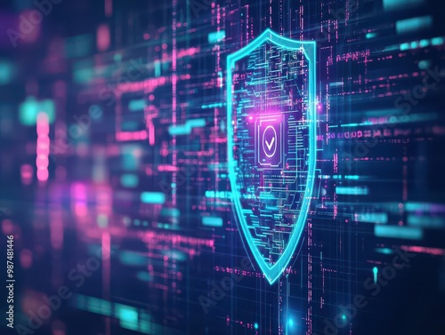 Cybersecurity shield, glowing holographic interface, dark digital background, futuristic protection