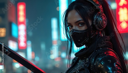 Cyborg ninja woman with sword poses in dark tech armor. Female warrior wears mask, headphones in futuristic city at night. Neon signs light up dark urban street. Looks ready for action, mysterious
