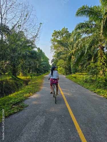 Cycling through the tranquil green landscape of Chumphon Thailand on a sunny day