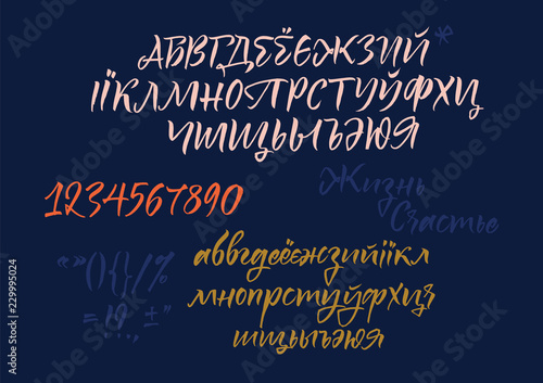 Cyrillic calligraphic alphabet. Contains lowercase and uppercase letters, numbers and special symbols.