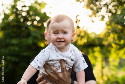 Dad holds his little daughter in his arms, summer sunset, An emotional child