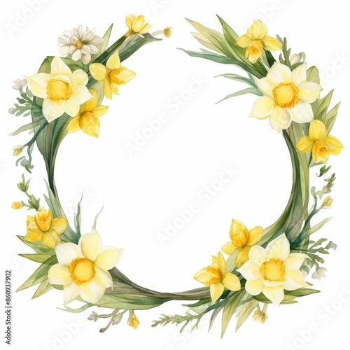 Daffodil frame clipart with daffodils framing a central image or text. watercolor illustration, white color background. Greeting cards, invitations, banners, covers.