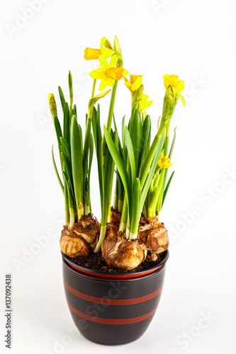 flower, pot, daffodil, isolated, yellow, narcissus, spring, white, nature, plant, blossom, green, background, fresh, season, bloom, leaf, natural, floral, beautiful, blooming, easter, garden, springtime, botanical, gardening, beauty, stem, bulb, celebration, bright, seasonal, colourful, flora, colours, head, botany, growth, vibrant, flowerpot, bunch, growing, romance