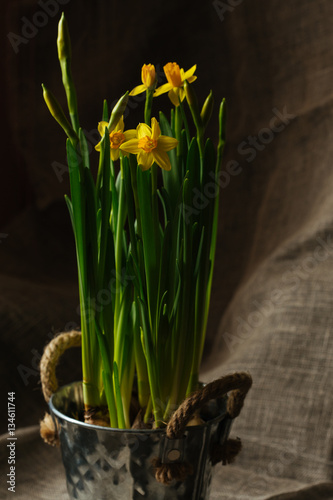 bouquet, easter, flower, narcissus, pot, retro, season, spring, green, yellow, blossom, colours, life, old, plant, still, bulb, daffodil, holiday, nature, background, bunch, floral, vintage, metal, bow, card, copy, decoration, dirty, gardening, greeting, growth, leaf, old-fashioned, paper, pattern, revival, ribbon, scratched, summer, symbol, textured, vase, vertical, beautiful, clothes
