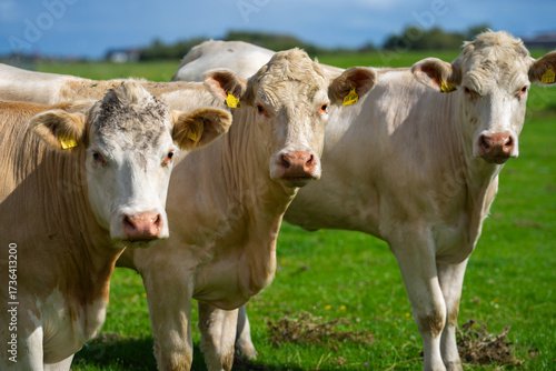 Dairy cow farming. Mammals grazing in the field. Cow on a ranch. Pasture filled with cows and calves. Bovine cow in the countryside. Field of grazing livestock. Grazing cow.