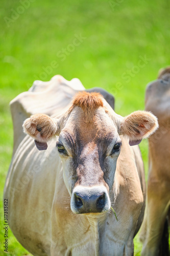 Dairy cows in open green field space in Australia after rain on a hot summer day