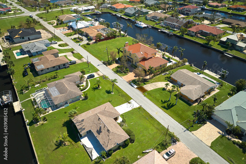 Damaged home rooftops after hurricane Ian in Florida coastal residential area. Consequences of natural disaster