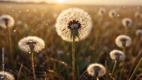 Dandelion Seed Head Glowing in Field at Sunrise with Dew