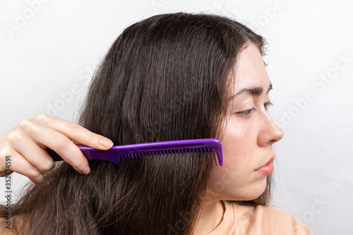 Dandruff and hair problems. A woman combs her long dark hair. Side view. White background