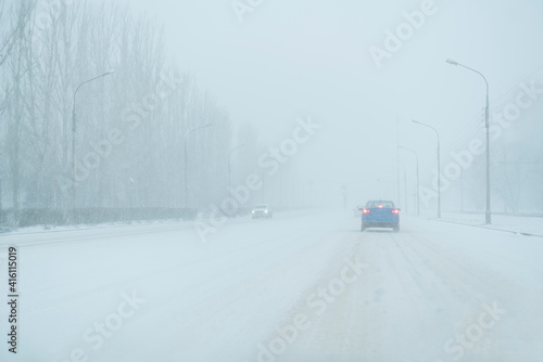 dangerous stormy weather in the city, collapse, snowfall on highway, winter season