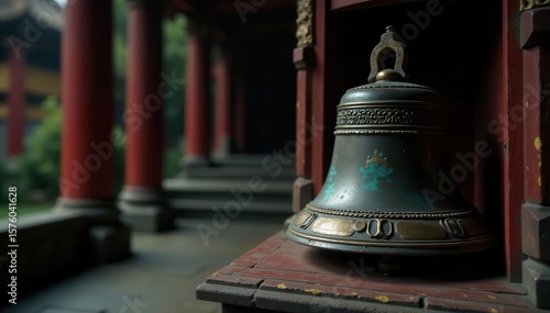 Dark, aged temple bell, wooden clapper inside, locked, contrast, macro, mystery