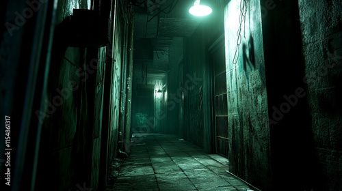 confinement, cinematic, background, claustrophobia, creepy, mystery, suspense, dark, gloomy, eerie, scarey, urban, city, night, street, atmosphere, mood, setting, environment, texture, grunge, worn, old, decay, desolate, abandoned, graffiti, shadow, light, contrast, teal, green, blue, grey, stone, concrete, wall, door, building, architecture, horror, thriller, realistic