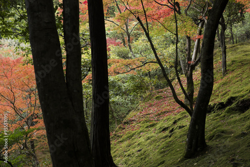 Dark autumn forest with Japanese Maple trees and moss covered ground.