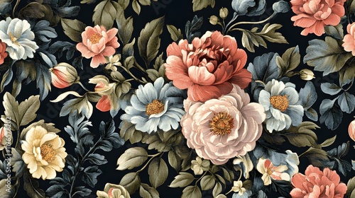 flower, rose, peony, dark, background, pattern, floral, design, textile, fabric, wallpaper, art, illustration, vintage, antique, style, elegant, luxury, sophisticated, bloom, blossom, flower petals, leaf, stem, bud, botanical, nature, beauty, colours, texture, detail, ornate, embroidery, painted, realistic, seamless, repeat, motif, intricate, rich, shades, tone, pastel, deep