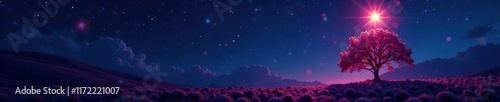 Dark background with swirling neon lights, star on top of the tree, magical ambiance, starlight