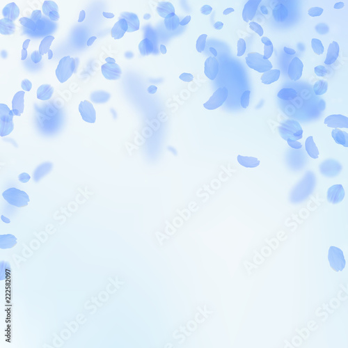 Dark blue flower petals falling down. Valuable romantic flowers falling rain. Flying petal on blue s