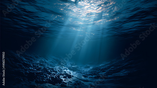 Dark blue ocean surface seen from underwater, An underwater view of the ocean floor, showcasing a dramatic beam of sunlight penetrating the deep blue water.