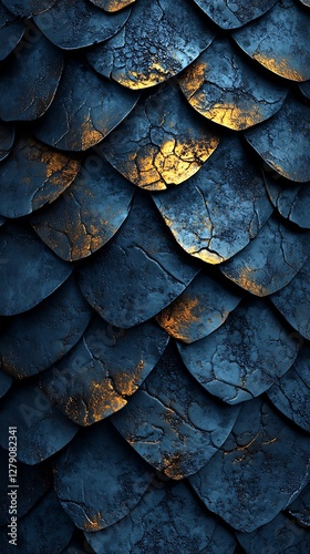 Dark blue scales, gold highlights, texture background, fantasy game design