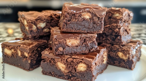 Dark chocolate brownies stacked with a drizzle of melted chocolate on top.