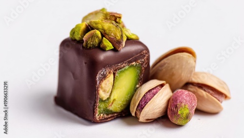 Dark chocolate pistachio truffle with a green pistachio center, topped with chopped pistachios and surrounded by shelled pistachios. Concept Dark Chocolate Truffle, Pistachio Center
