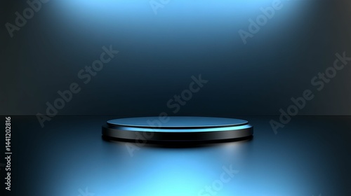 dark, circular, platform, blue, light, illuminated, lighting, metallic, product, display, stage, modern, design, empty, presentation, three-dimensional, rendering, spotlight, round, smooth, surface, minimalist, geometric, shape, space, showcase, glowing, circle, scene, exhibition, technology, futuristic, contemporary, studio, background