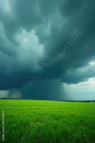 Dark clouds gather over a lush green field with strong gusts and heavy rainfall, cloud, farm