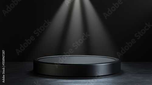 black, dark, cylinder, platform, spotlight, illumination, background, texture, circle, round, stage, pedestal, display, product, showcase, presentation, modern, minimalist, design, clean, simple, elegant, luxury, abstract, studio, render, three-dimensional, grey, shadow, light, shiny, metallic, smooth, surface, concept, empty, blank, scene, matte, contrast, ambience, atmosphere, mood, depth