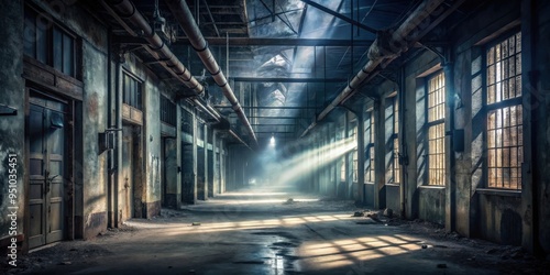 Dark, eerie corridor in abandoned factory with shadows and dust particles
