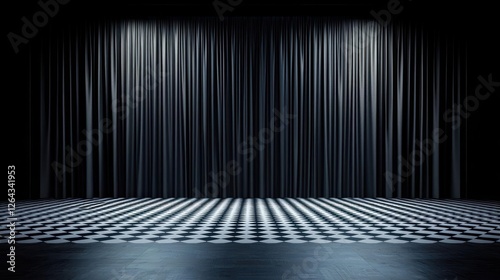 Dark Empty Stage With Illuminated Curtain And Patterned Floor