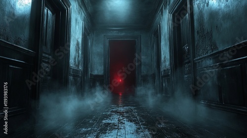 hallway, darkness, fog, light, red, eerie, suspense, fear, atmosphere, shadow, wall, door, abandoned, mysterious, haunting, ghostly, creepy, silence, depth, perspective, architecture, interior, design, texture, decay, horror, visual, cinematic, surreal, dramatic, ominous, isolation, environment, scene, ambience, mystery, illusion, chilling, space, evacuated, exploration, unknown, tension, surrealism, paranormal, twilight, allure