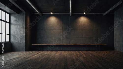 Dark gallery interior with concrete walls, mock up place and wooden flooring