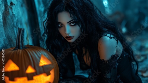 Dark Gothic Halloween Aesthetic with Pumpkins and Mysterious Girl