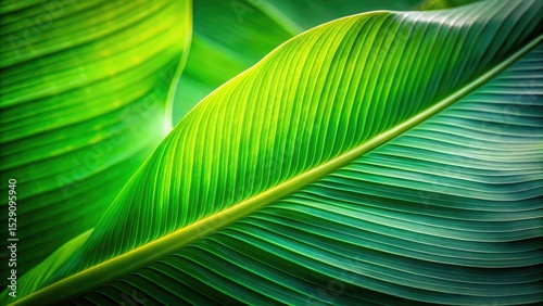 Dark green banana leaf, macro-photographed in high resolution, exhibits a compelling tilt-shift texture.