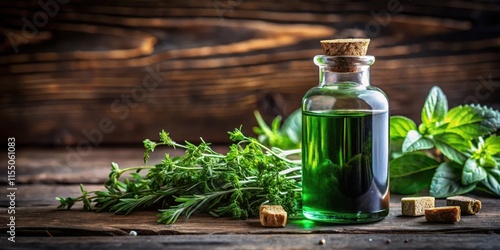 Dark green liquid in a glass bottle with a cork stopper, surrounded by a rustic wooden background and some fresh herbs, food, extra virgin olive oil