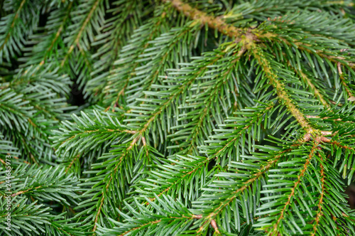 Dark green needles on the branches of coniferous tree fir Abies nordmanniana as dark green background. Close-up of branches Caucasian Fir or Christmas tree in natural sunlight. Place for your text.