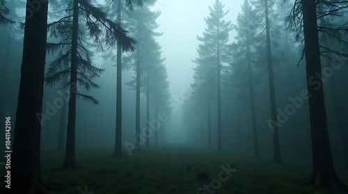 Dark Green Pine Forest Covered in Heavy Morning Mist with Deep Atmospheric Mood