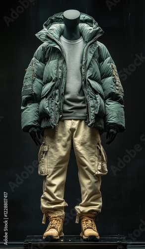 Dark green puffer jacket, beige cargo pants, and brown boots on a mannequin.
