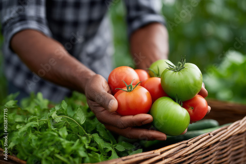tomatoes, harvest, hand, gardening, vegetable, red, green, fresh, organic, farming, agriculture, basket, wicker, close, up, food, produce, dirtied, earth, healthy, natural, summer, garden, farm, ripe, unripe, leafy, greener, cucumber, plant, growth, cultivation, nourishment, diet, cooking, ingredient, countryside, rural, rustic, dark, skin, dirt, nature, sunlight, dew, vibrant, colourful, abundant