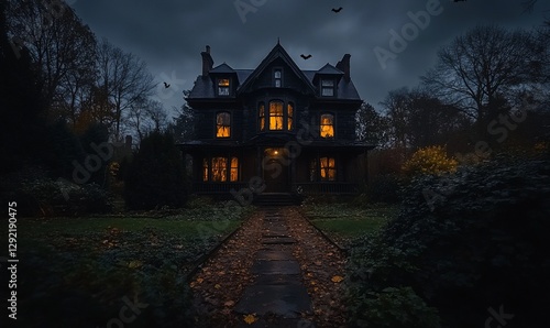 house, night, dark, skittish, fall, leaf, bat, path, tree, glowing, haunted, halloween, building, exterior, architecture, home, landscape, ominous, luxury home, eerie, gothic, scarey, twilight, evening, shadow, autumn, season, mystery, residence, rural, estate, property, october, setting, gloomy, quiet, stillness, solitude, alone, isolated, creepy, dusk, light, window, pathway