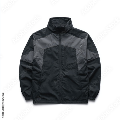 jacket, dark, grey, panel, anorak, sport, casual attire, fashion, waterproof, polyester, lightweight, zip, pullover, collar, long, sleeve, snap, buttons, closure, modern, trendy, style, functional, practical, hard-wearing, protection, weather, rain, wind, active, comfortable, warm, cool, top, clothing, apparel, design, material, fabric, quality, new, black, grey