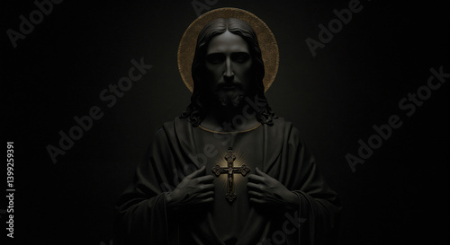 Dark Jesus Christ Statue Gold Halo Cross Black Background