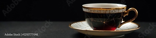 Dark liquid in a cracked porcelain glass cup with gold rim and handle, porcelain, decorative, black