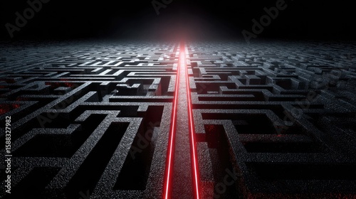 labyrinth, path, red, laser, dark, black, grey, stone, illuminated, light, solution, way, direction, guidance, success, challenge, puzzle, intricate, complex, obstacle, journey, progress, finding, target, clear, straight, forward, marked, sharpened, problem, solving, strategy, decision, future, destination, goal, enigma, design, perspective, three-dimensional, modern, abstract