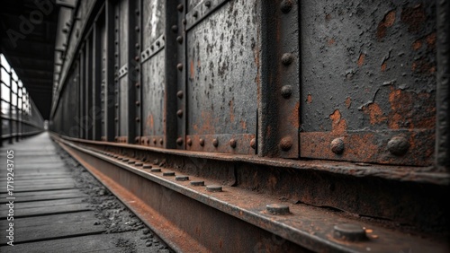 railway, bridge, metal, rust, decay, texture, erosion, industrial, track, rail, dark, weathered, abandoned, infrastructure, landscape, perspective, urban, construction, nature, steel, detail, line, design, depth, historical, monochrome, grey, background, contrast, vintage, structural, scenery, forgotten, element, symmetry, shadow, outdoors, pattern, view, concrete, east, iron, worn, journey, passage, history, metalwork