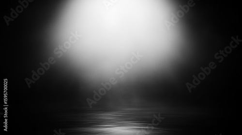 Dark misty scene with light shining down on calm reflective water creating a mysterious and eerie atmosphere