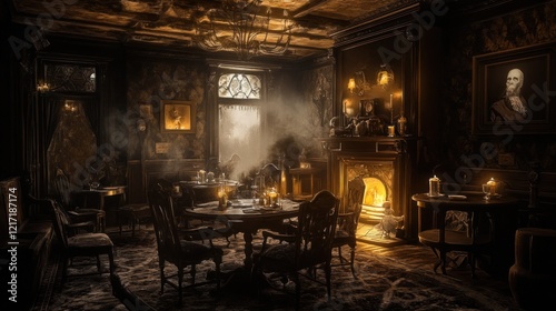 room, interior, antique, dark, mysterious, haunted, skittish, old, vintage, luxury home, house, home, gothic, scarey, creepy, fog, smoke, candle, fireplace, fire, wood, furniture, chair, table, portrait, painting, art, wall, window, light, shadow, dust, gloomy, atmosphere, ambience, elegance, luxury, rich, history, heritage, estate, night, evening, stillness, silence, secret, forgotten