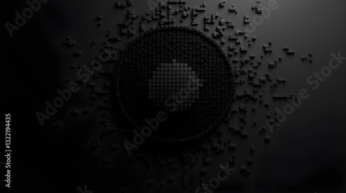 black, dark, grey, circle, pixel, grid, texture, shadow, light, contrast, abstract, digital, technology, modern, futuristic, minimalist, ominous, mysterious, intense, dramatic, serious, art, design, render, shape, form, fragment, disintegrate, break, erode, decay, destruction, depth, surface, block, monochrome, dim, gloom, evacuated, space, structure, pattern, graphic, pixelated, computer, electronic