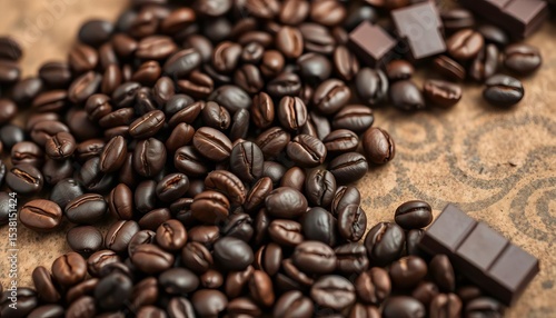 Dark roasted coffee beans scattered near rich dark chocolate pieces, grains, luxury
