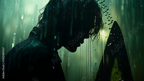 Dark silhouette of a person hair drenched beside harp in the rain Moody ambiance and the texture of water droplets en