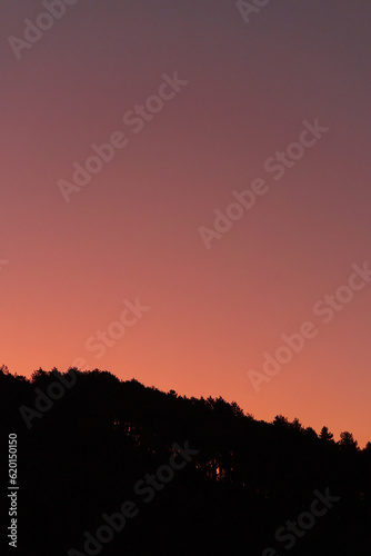 Dark silhouette of hills on pink sunrise view. Sundown landscape with purple color sky
